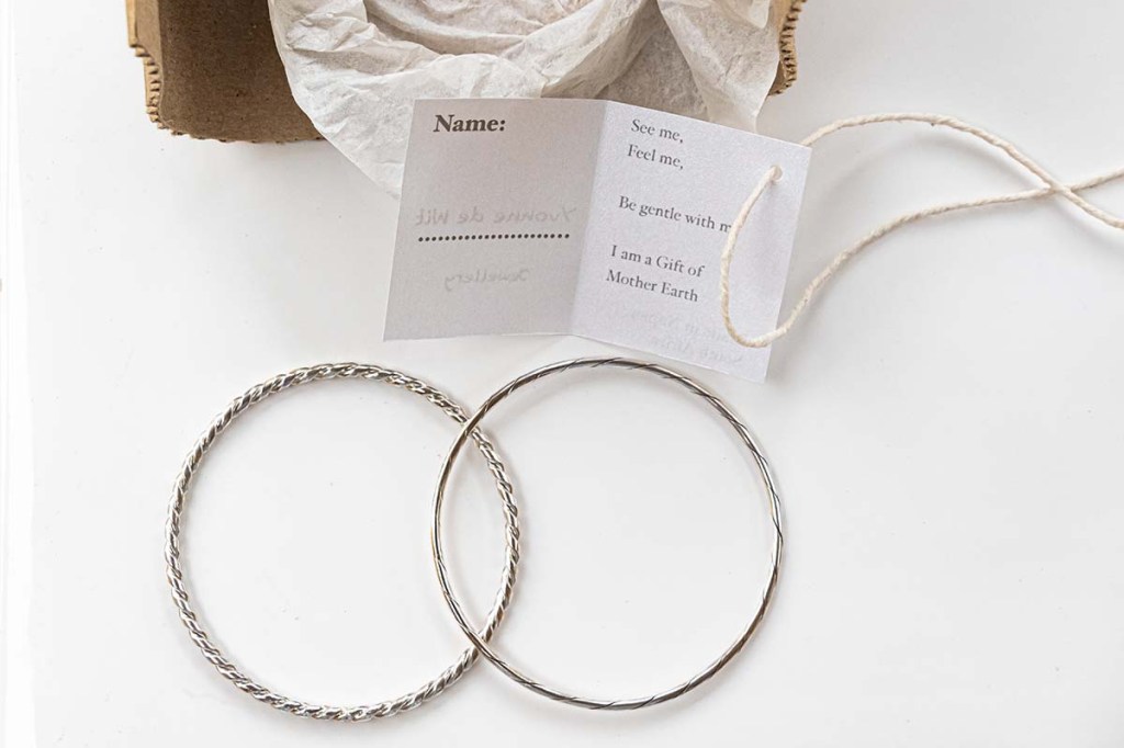Each piece of jewellery is lovingly packaged by hand by Yvonne de Wit, using reclaimed corrugated cardboard, a material often overlooked, now uplifted with purpose and care. Wrapped simply in natural rope, every parcel becomes a reflection of the collection itself: humble, thoughtful, and deeply connected to the Earth.
